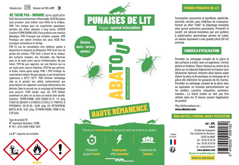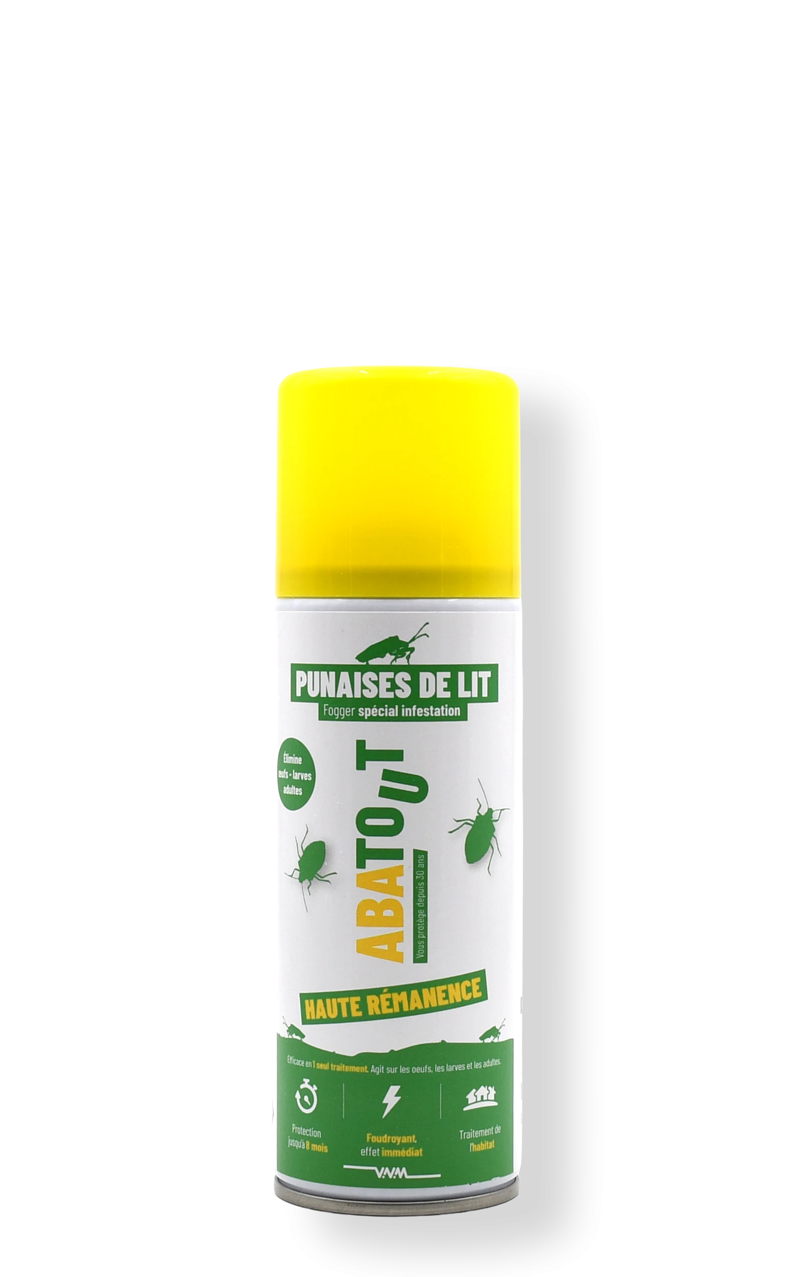 ABATOUT Laque anti-Punaises & Punaises de lit – Fogger 150 ml est un insecticide fumigène monodose, spécialement formulé pour les invasions sévères de punaises de lit.