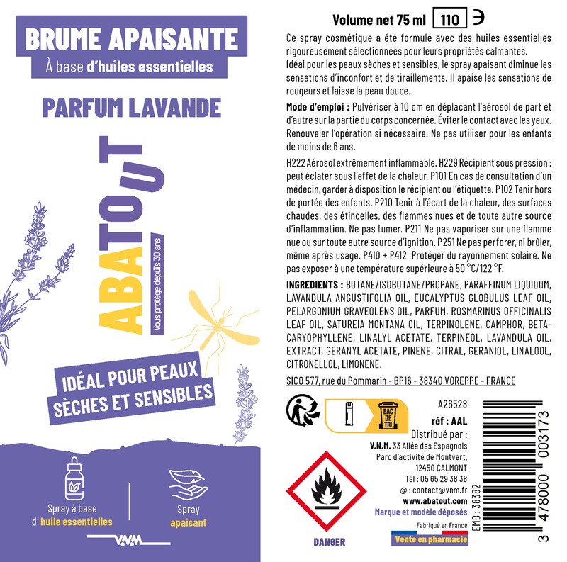 ABATOUT Brume apaisante senteur lavande – 75 ml est spécialement formulée pour apaiser les piqûres de moustiques et les irritations cutanées. Grâce aux huiles essentielles de lavande, elle calme rapidement les démangeaisons, rougeurs et tiraillements, procurant un confort immédiat à la peau.