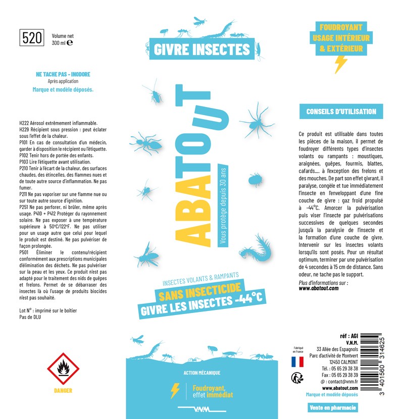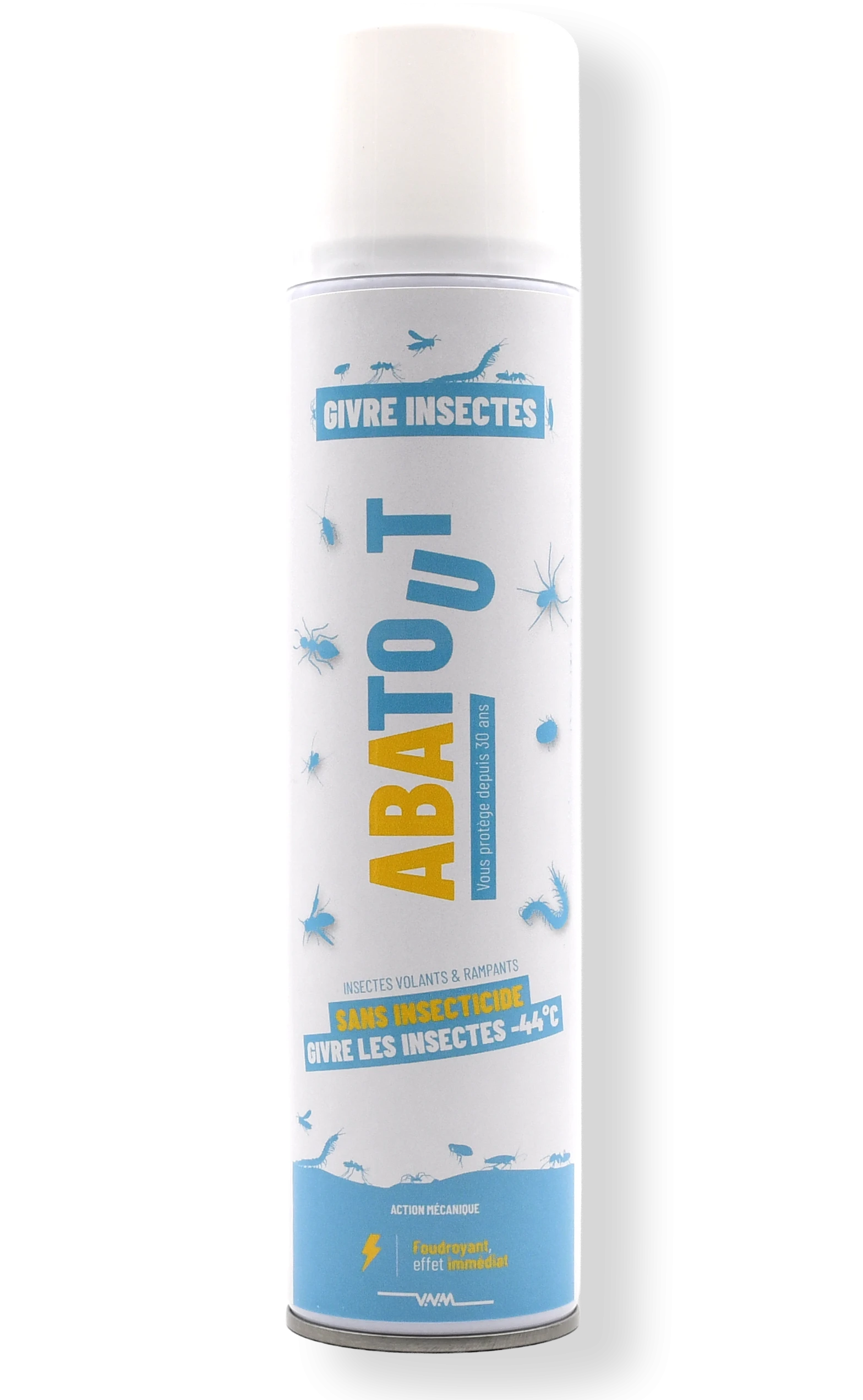 ABATOUT Givre Insectes est un spray insecticide sans substance chimique, qui agit par congélation instantanée à -44°C. Il paralyse et tue immédiatement les insectes en les enveloppant d’une fine couche de givre, sans odeur et sans tacher les surfaces.
