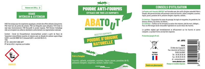 ABATOUT Poudre anti-fourmis est une solution prête à l’emploi, formulée avec des actifs d’origine naturelle, idéale pour lutter efficacement contre les fourmis et de nombreux insectes rampants.