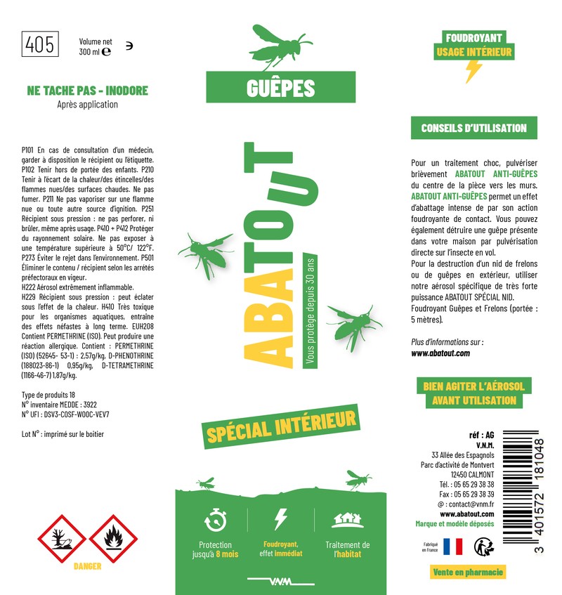 Type de produits 18 : Insecticides, acaricides et produits utilisés pour lutter contre les autres arthropodes. Cet insecticide anti-guêpes contient : 1R-trans phenothrin – 0,96 g/kg D-trans-tétraméthrine – 1,88 g/kg Perméthrine (ISO) – 2,58 g/kg