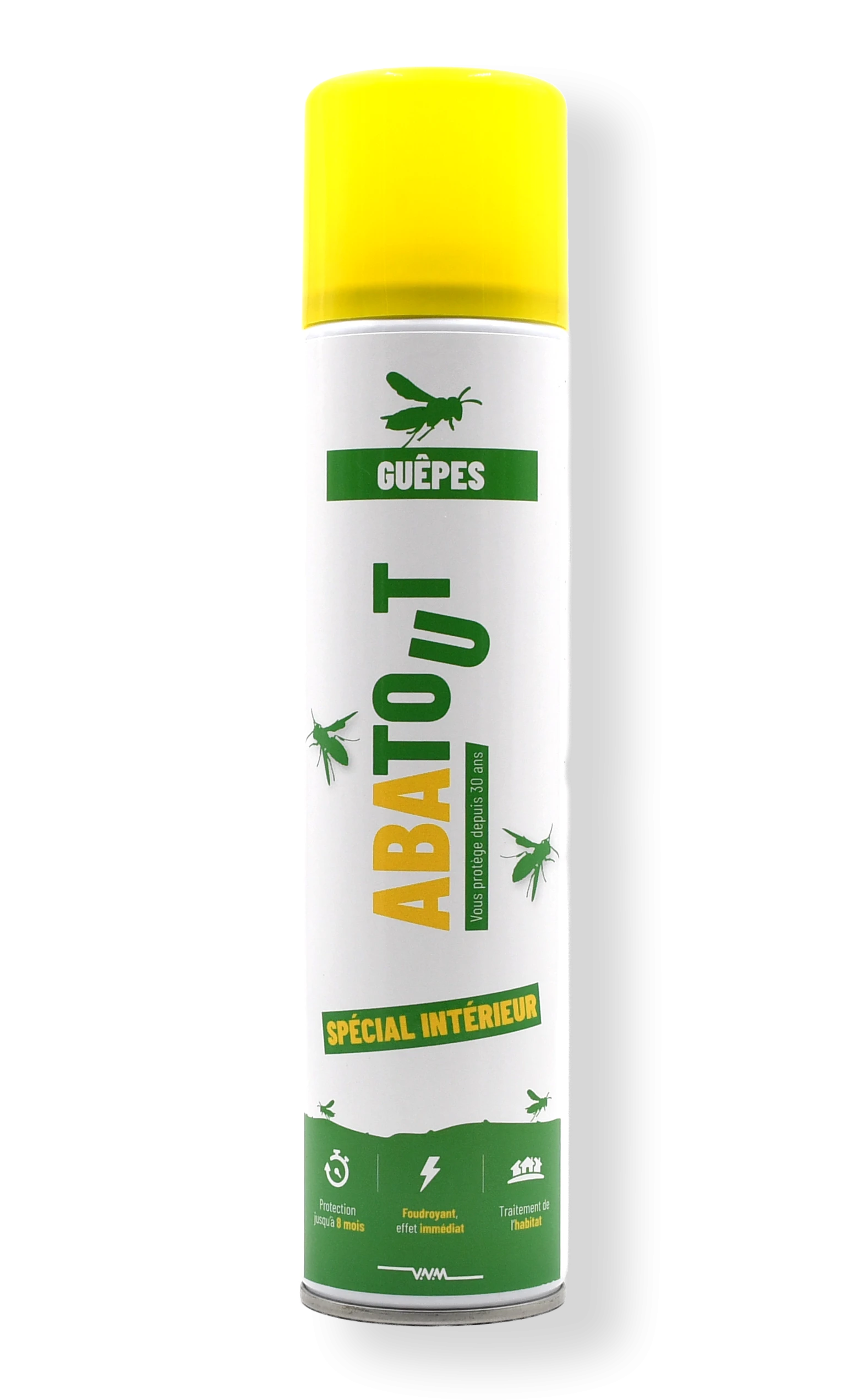 ABATOUT Anti-Guêpes 300 ml est un insecticide en aérosol spécialement formulé pour éliminer rapidement les guêpes et frelons à l’intérieur des habitations. Sa laque insecticide à effet choc agit par contact direct, provoquant un abattage immédiat de l’insecte, même en plein vol. Idéal pour une intervention rapide dans la maison, ce produit combine efficacité immédiate et effet persistant longue durée, tout en restant inodore après application. Sa persistance jusqu’à 8 mois (selon les supports) permet de prévenir les nouvelles intrusions et d’assurer une protection durable. Produit destiné à un usage intérieur.
