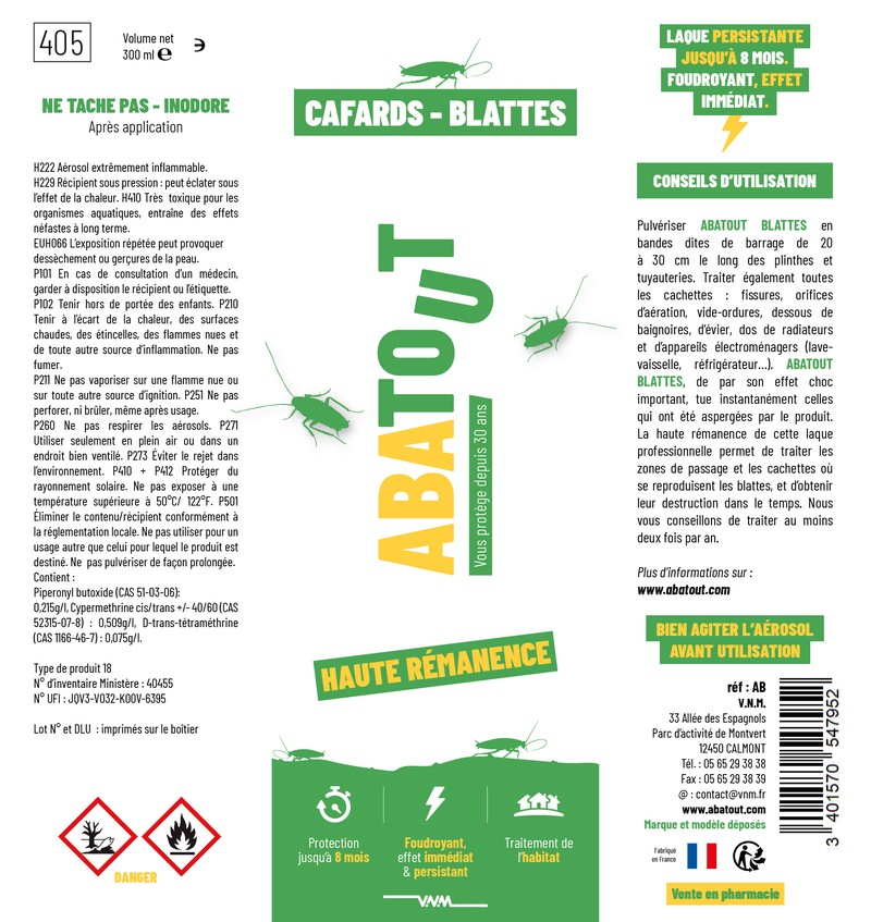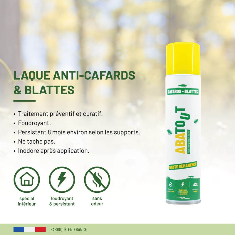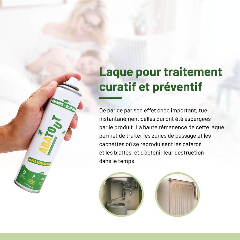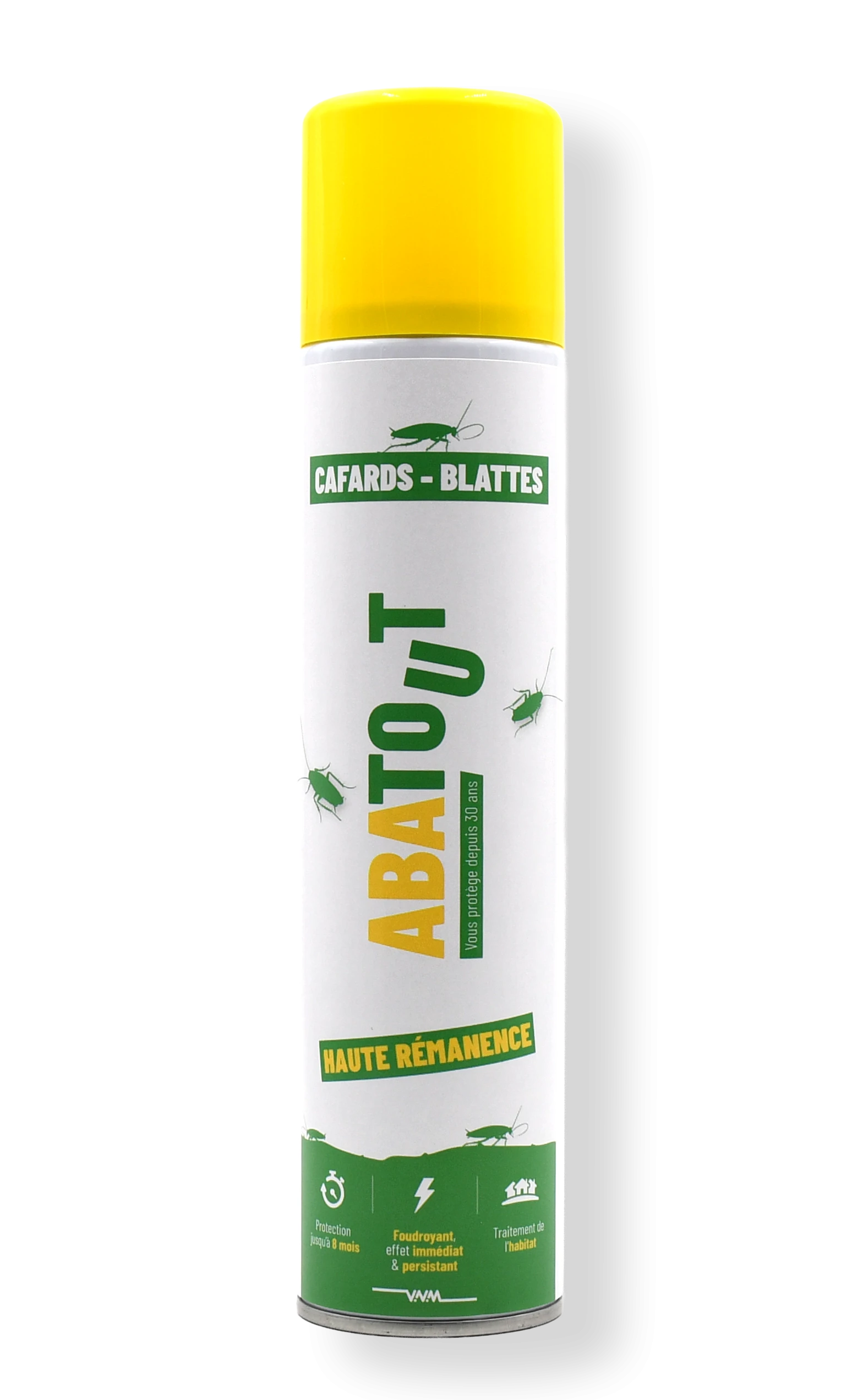 ABATOUT Laque anti-Blattes / Cafards 300 ml est un insecticide en aérosol destiné au traitement préventif et curatif des cafards et blattes en intérieur.