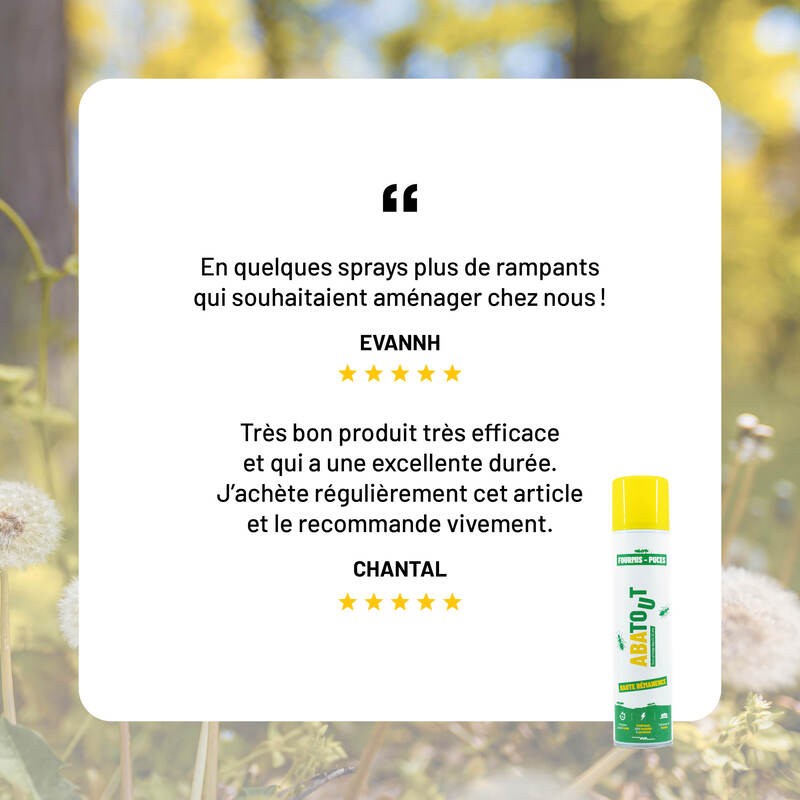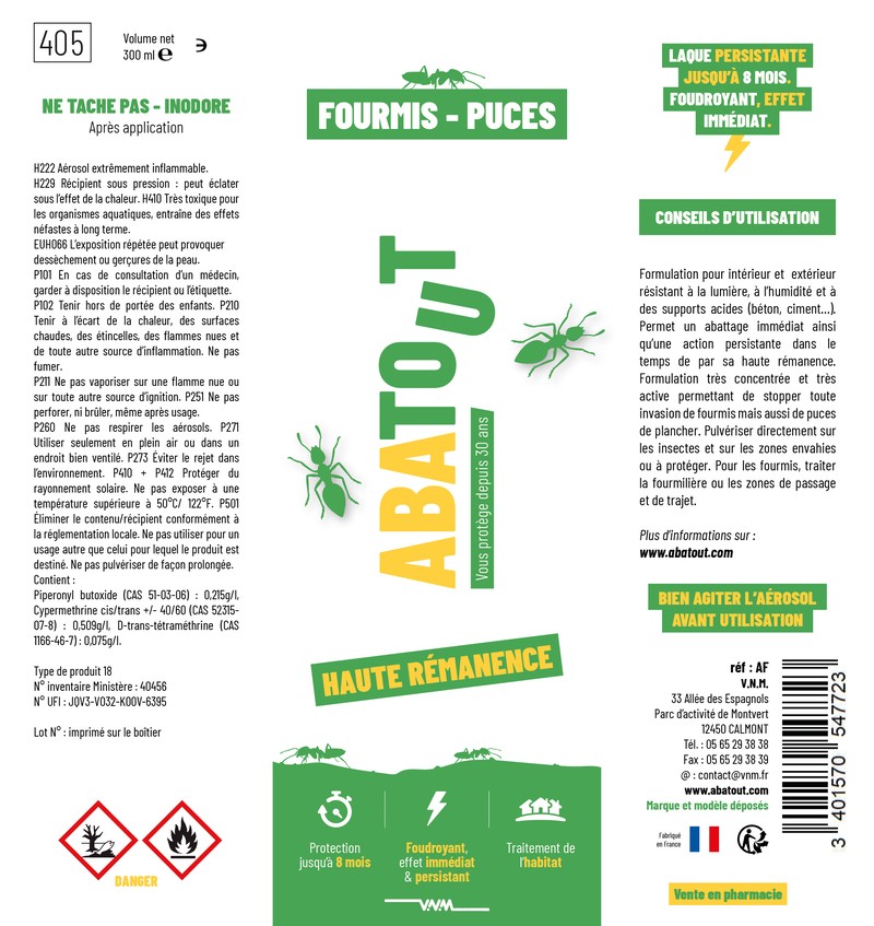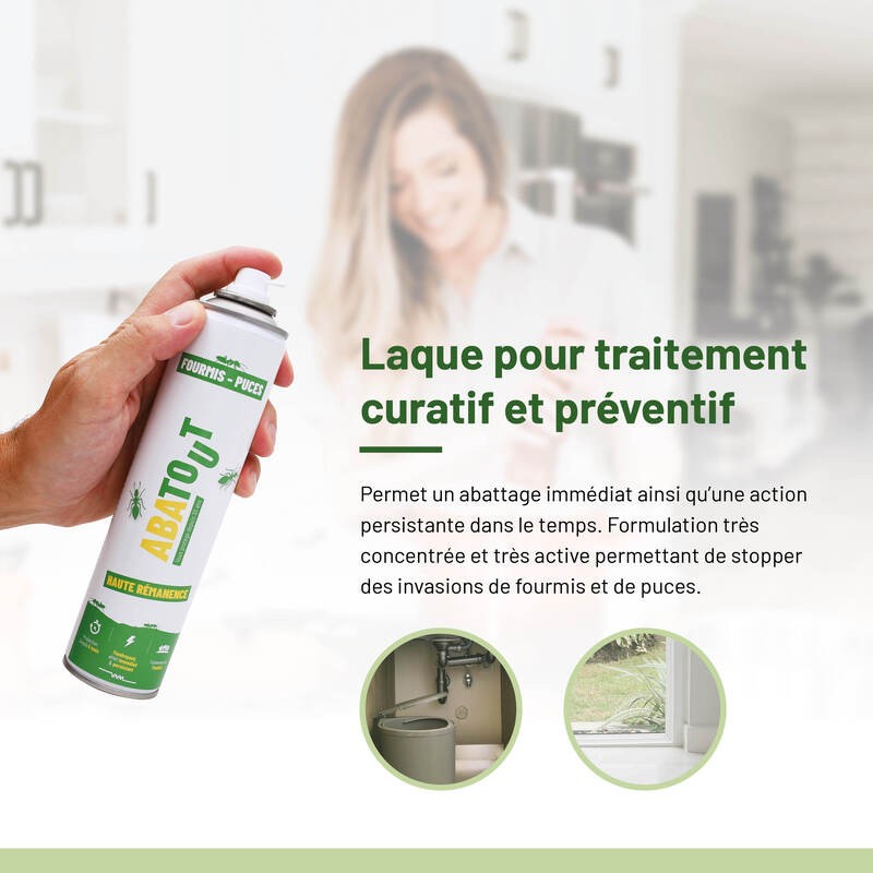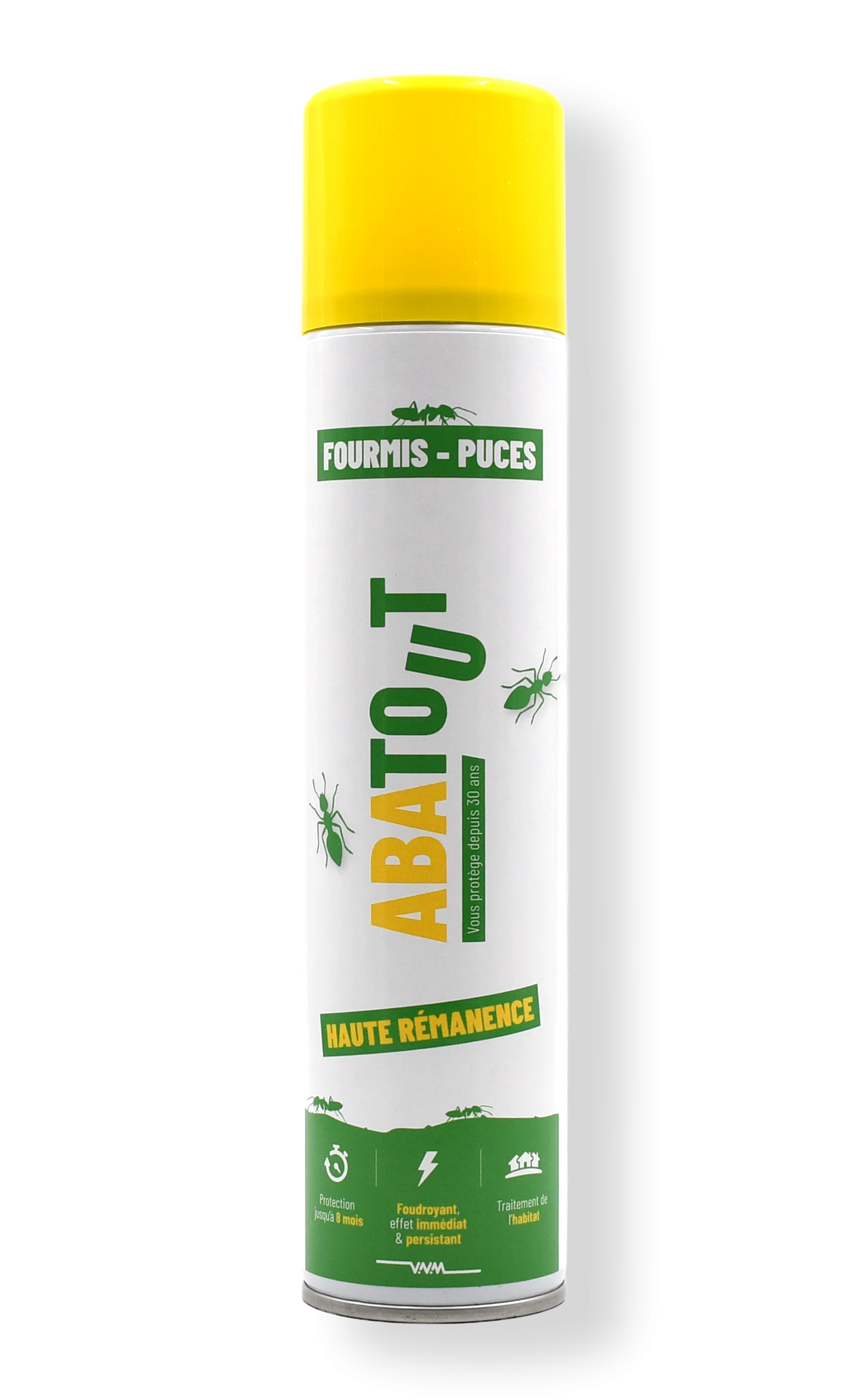 ABATOUT Laque anti-Fourmis, Puces & Gendarmes 300 ml est un insecticide en aérosol destiné à un traitement préventif et curatif contre les fourmis, les puces et les gendarmes, en intérieur comme en extérieur.